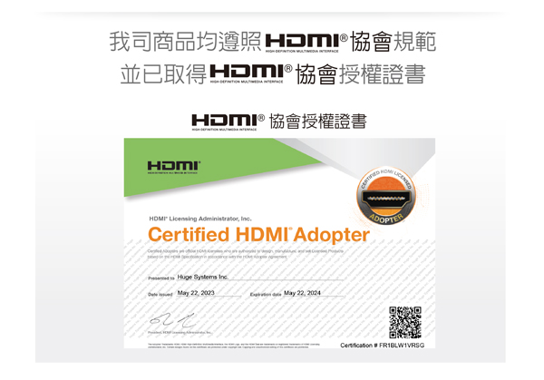 支援HDMI線材: 使用 AWG26 HDMI 標準電纜