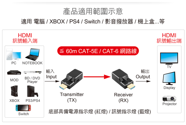 支援網路線材: 支援 CAT-6/5E 規格網路線:線材長度≦60公尺 (視輸出訊號決定)