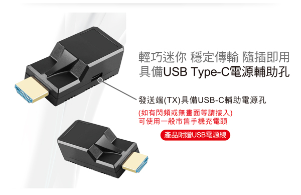 發送端(TX)具備USB-C輔助電源孔,附贈USB電源線