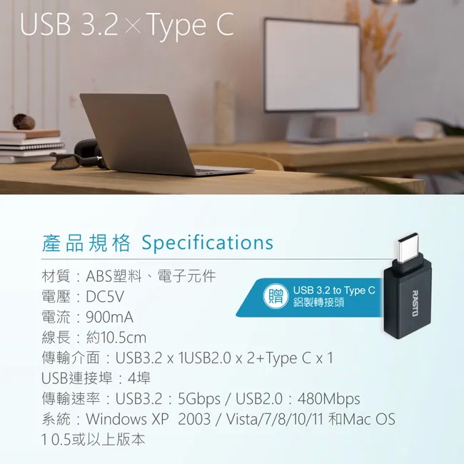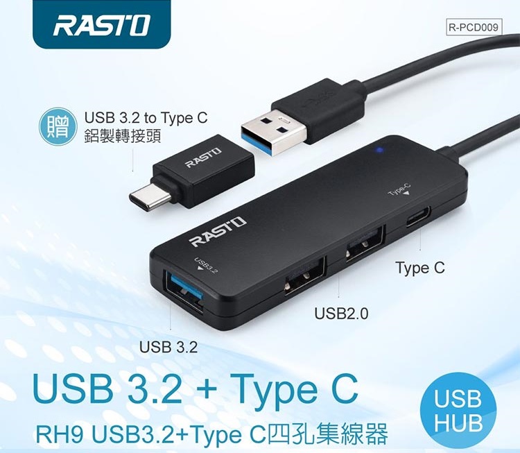 .LED指示燈,貼心設計RASTO RH9 USB3.2+Type C四孔集線器 贈Type C轉接頭