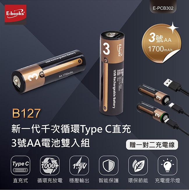 EBOOKS TYPEC直充3號充電池2入 B127