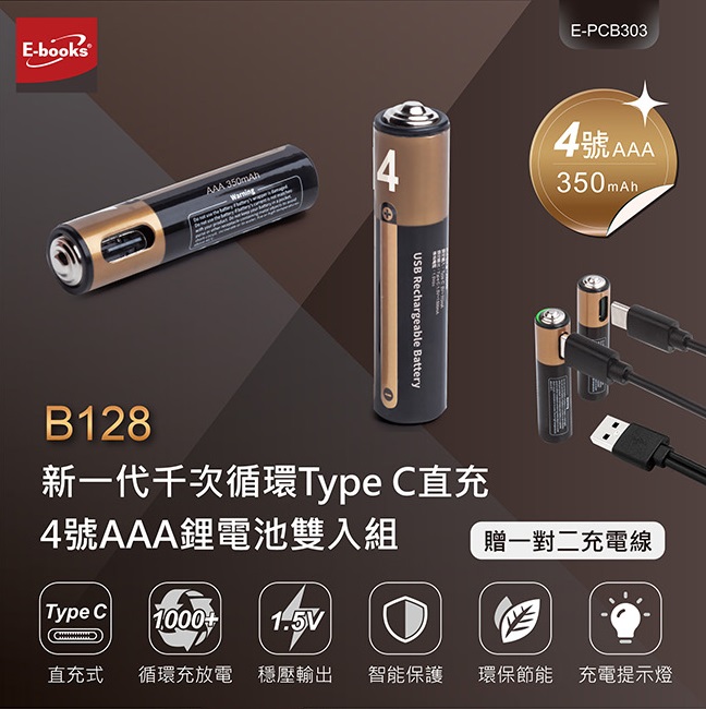 EBOOKS TYPEC直充4號充電池2入 B128 |
