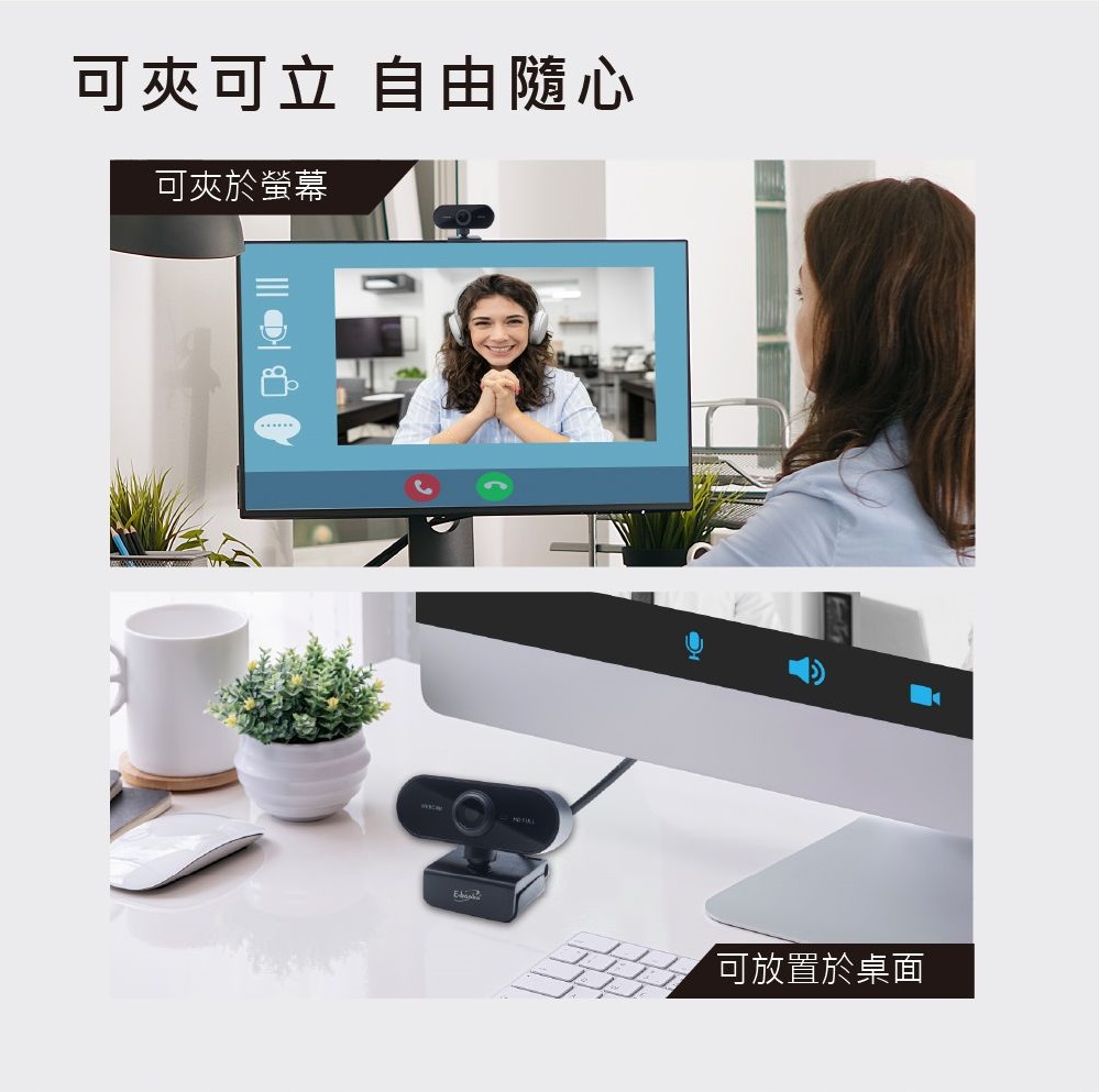 一體式設計和夾式底座,穩固安裝,節省空間,可夾於螢幕也可放置於桌面。