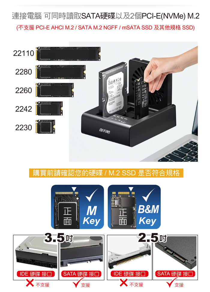 ● 連接電腦時,可同時讀取SATA硬碟以及2個PCI-E(NVMe)M.2