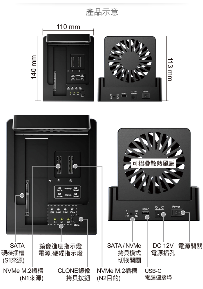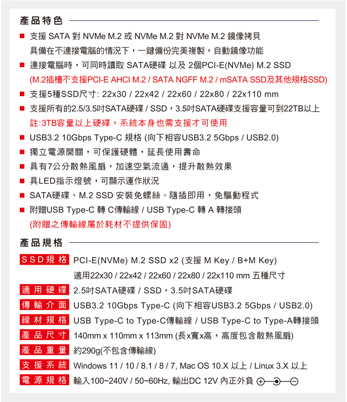 ● USB3.2 10Gbps Type-C規格。支援雙向互拷,可任意切換SATA或M.2