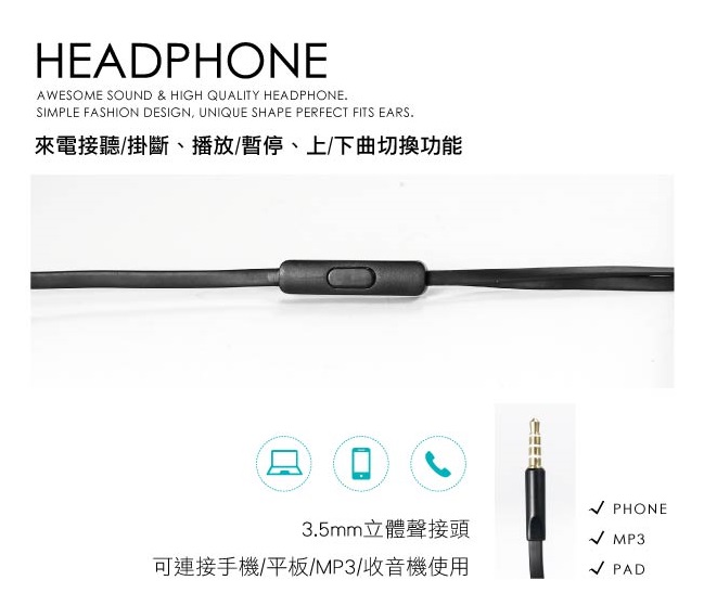 具有來電接聽/掛斷,播放/暫停,上/下曲切換功能。