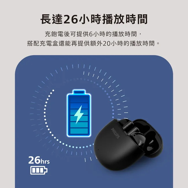 長達 26 小時的播放時間,快速充電 15 分鐘可聆聽 1 小時。