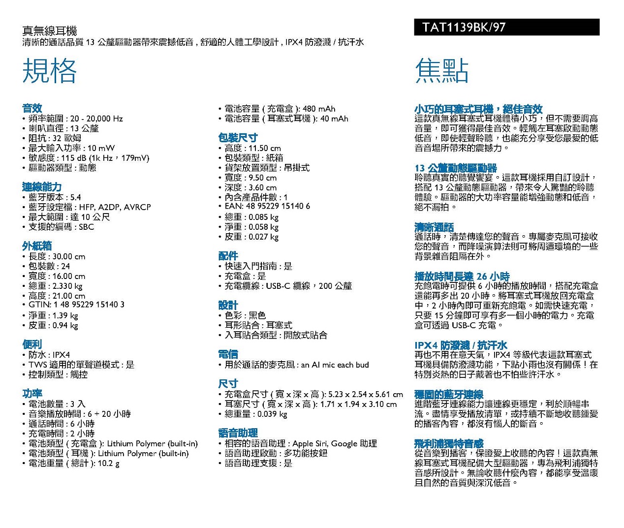 用於通話的麥克風:2 AI mics(左右耳各1個)