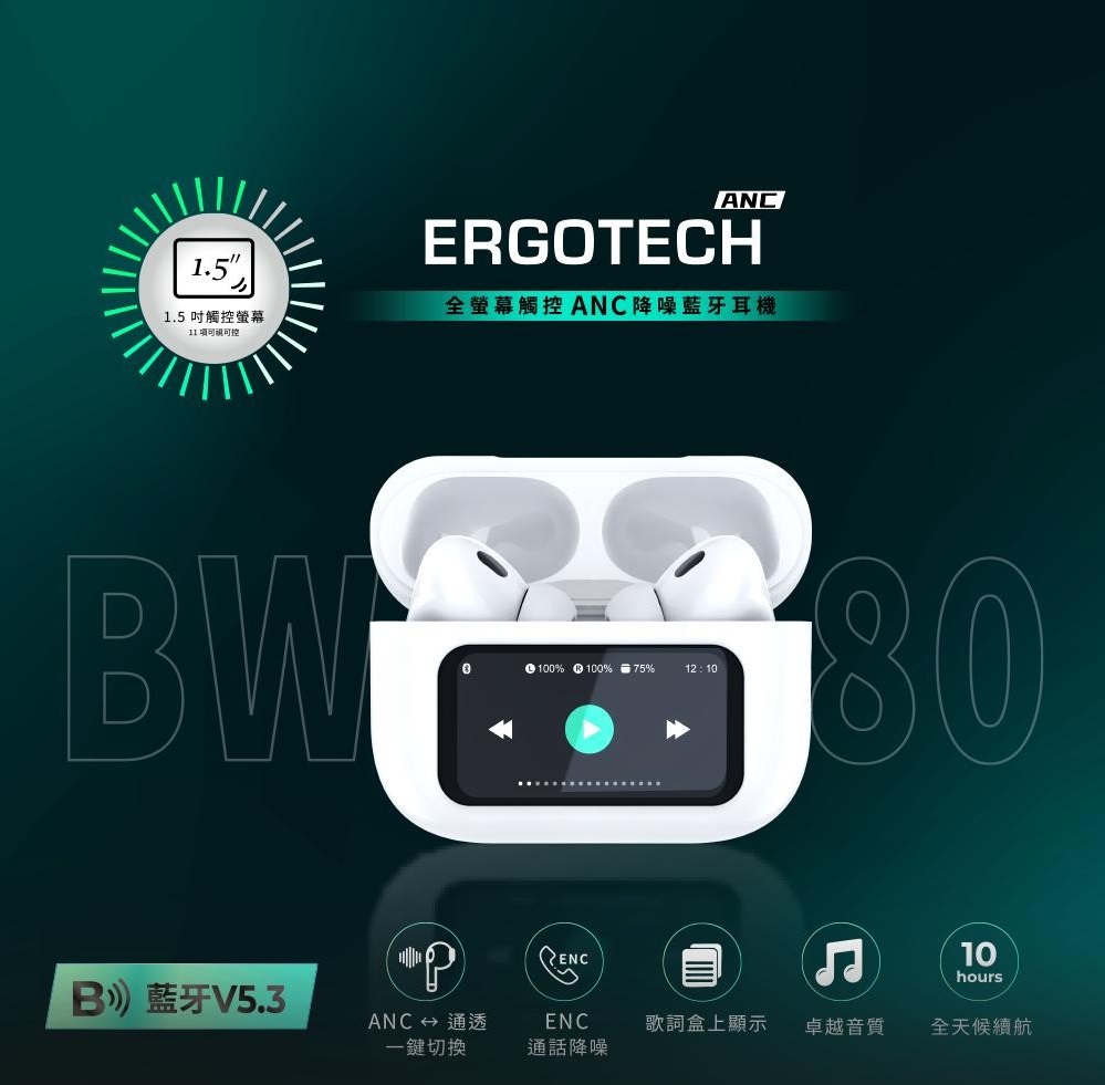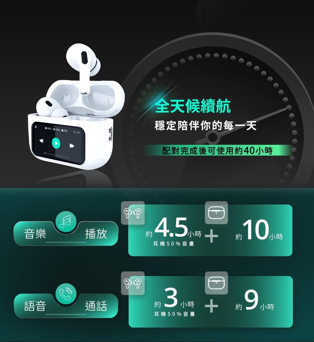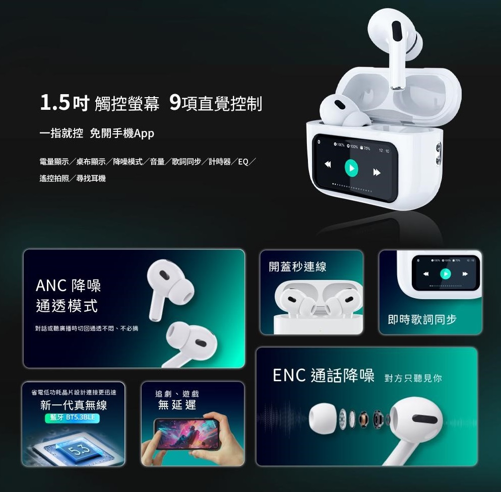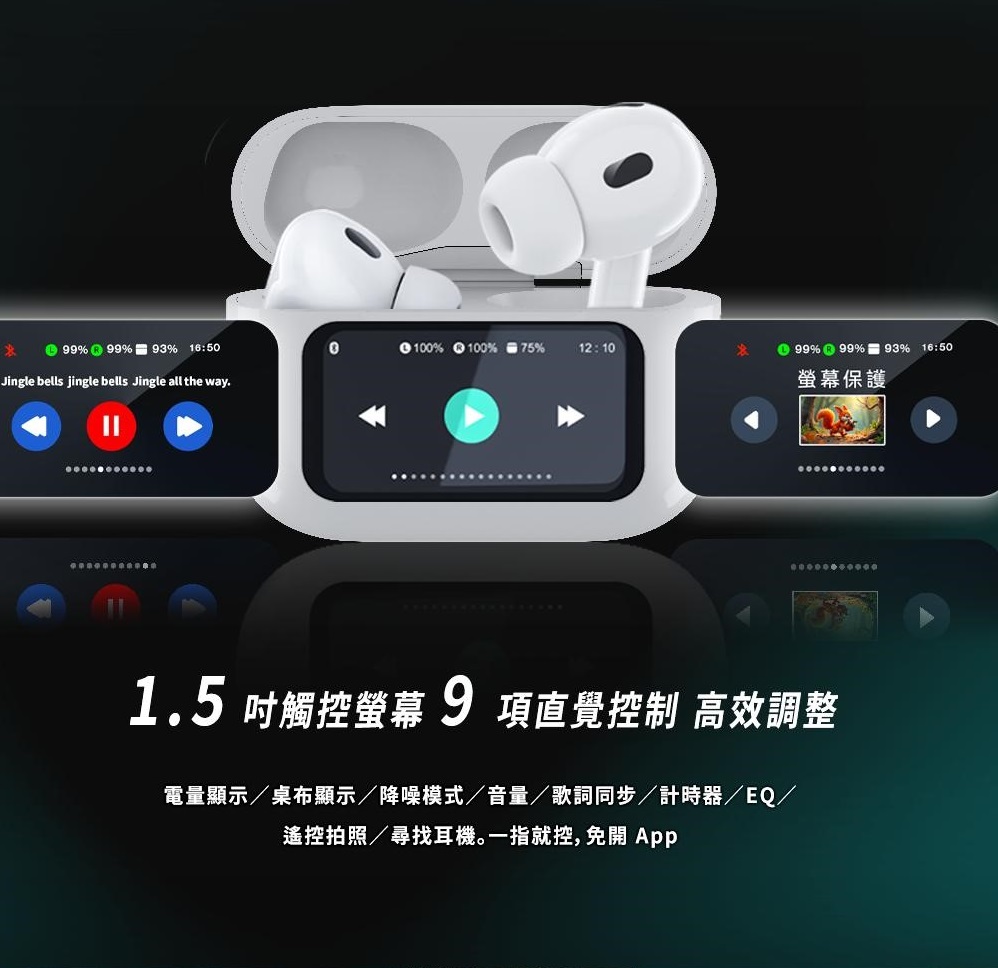 電量顯示/桌布顯示/降噪模式/音量/歌詞同步/計時器/EQ/遙控拍照/尋找耳機。一指就控,免開 App。