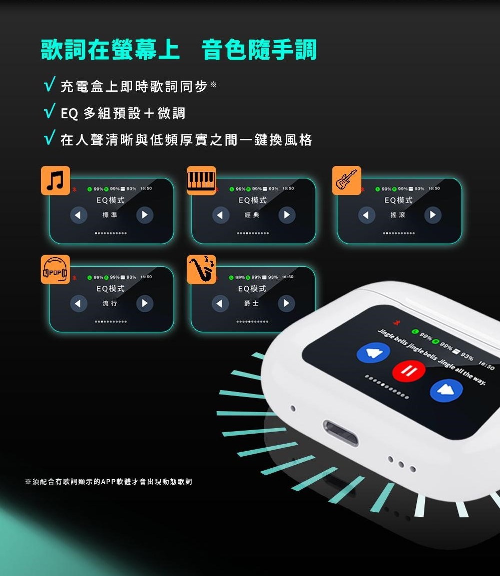 充電盒上即時歌詞同步;EQ 多組預設+微調,在人聲清晰與低頻厚實之間一鍵換風格。