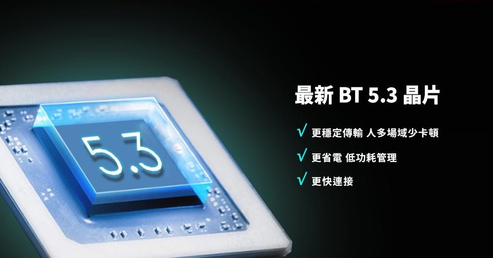 最新 BT 5.3 晶片:更穩(人多場域少卡頓)/更省電(低功耗管理)/更快連接。