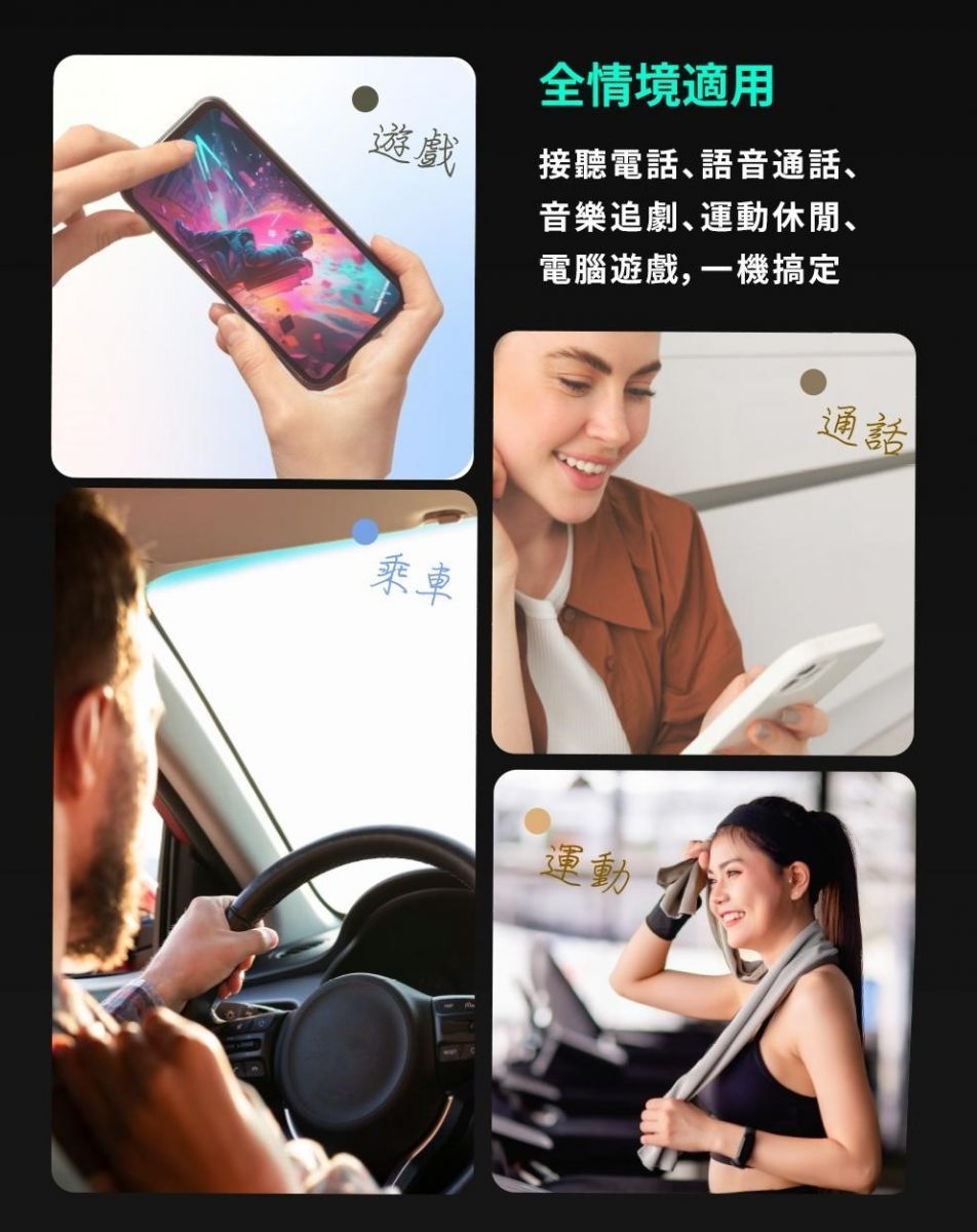 全情境適用:接聽電話、語音通話、音樂追劇、運動休閒、電腦遊戲,一機搞定。