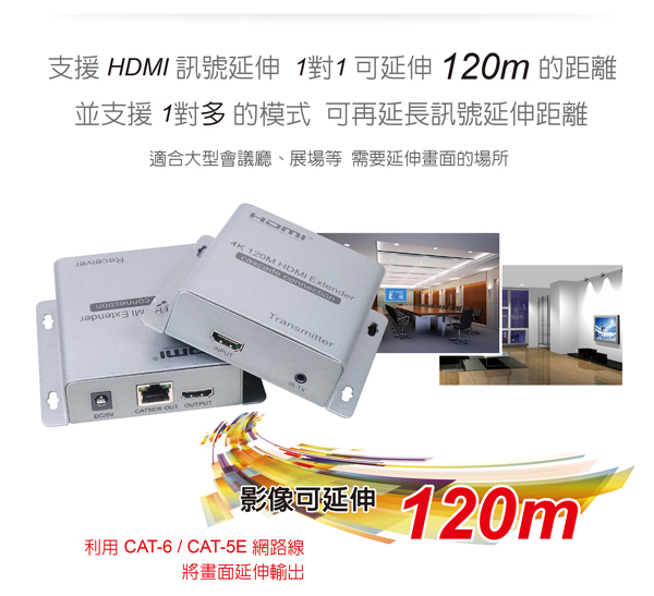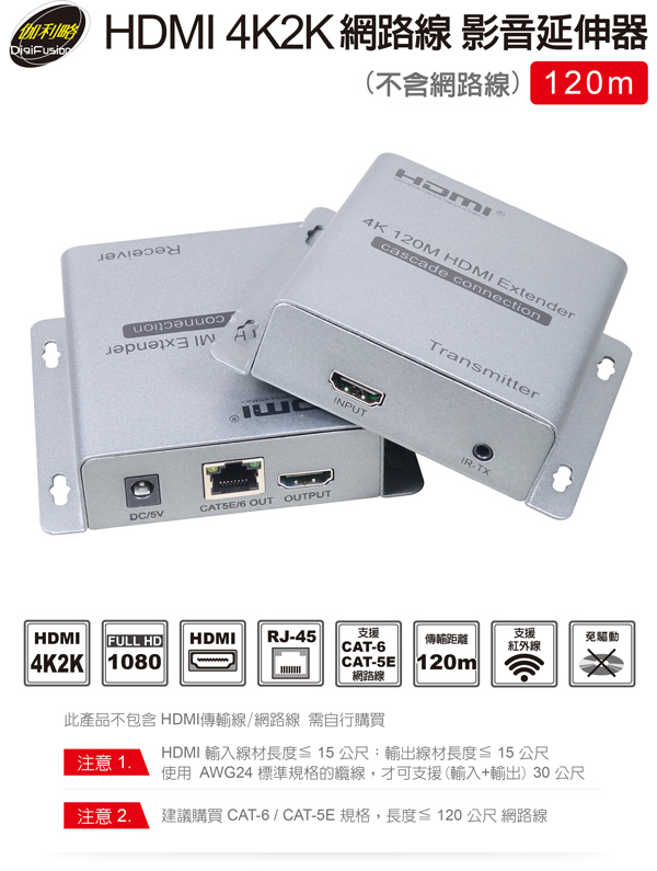 支援 CAT-6 / CAT-5E 規格以上網路線:線材長度≦ 120公尺