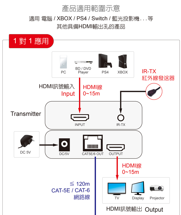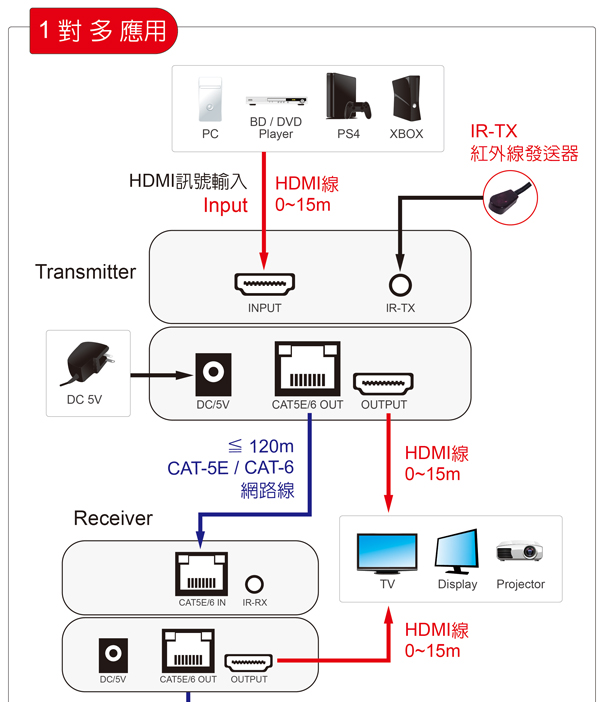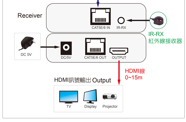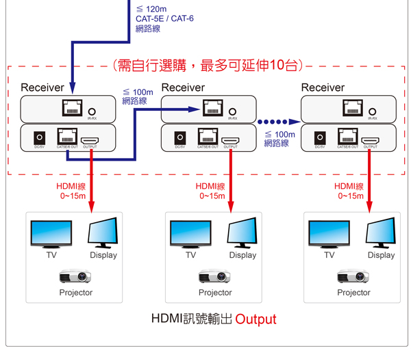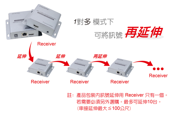 (此產品不包含網路線,需自行購買。第二台Receiver之後的串接延伸最大≦100公尺)