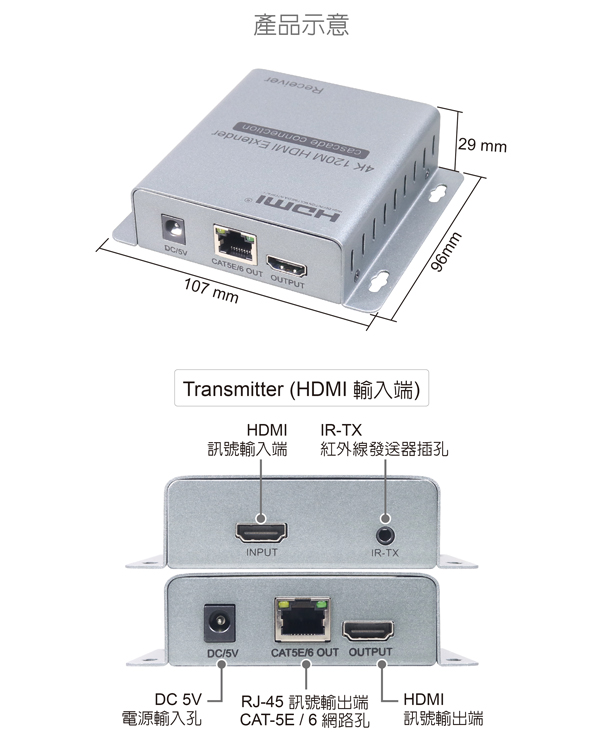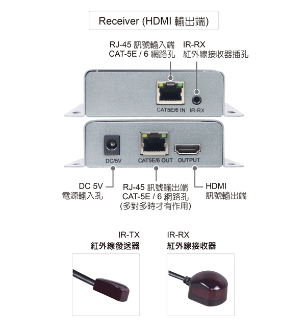 Transmitter: HDMI Input/IR-TX(3.5mm)/RJ-45(Output)/HDMI Output