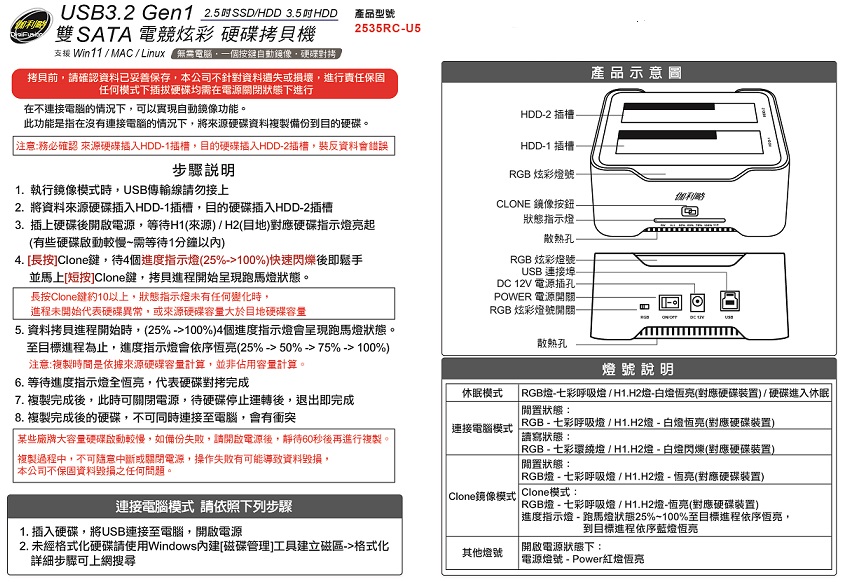伽利略 USB3.2 Gen1 雙SATA 2.5/3.5吋電競炫彩 硬碟拷貝機2535RC-U5 |