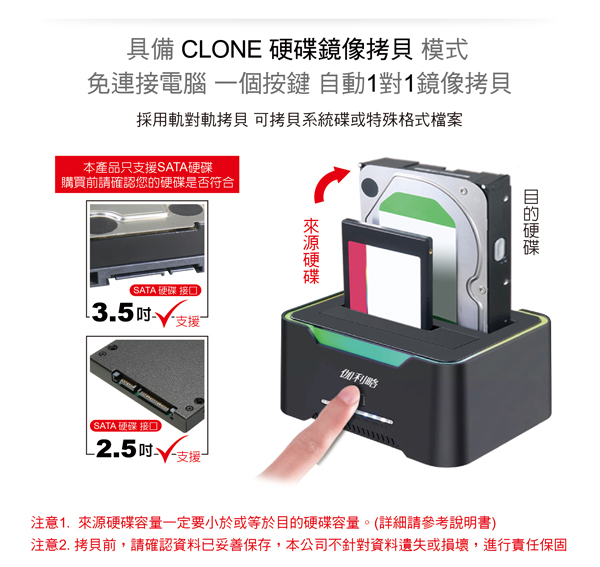 支援SATA HDD/SSD硬碟對拷,一鍵鏡像,無需電腦