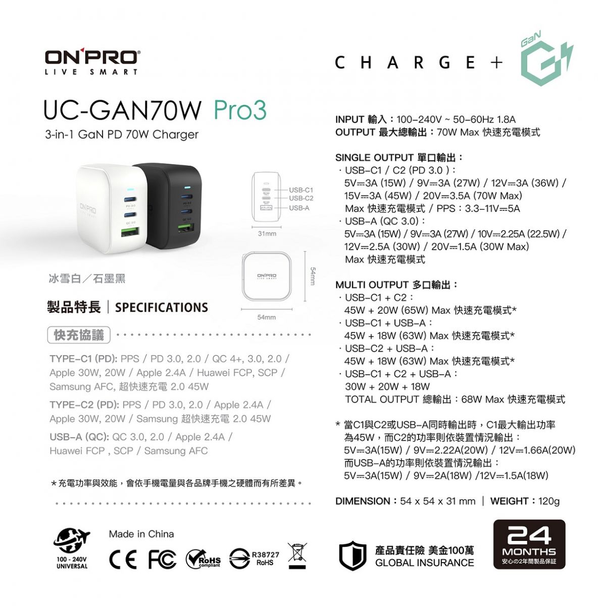 ONPRO PD70W 氮化鎵GaN快充充電器UC-GAN70W Pro3