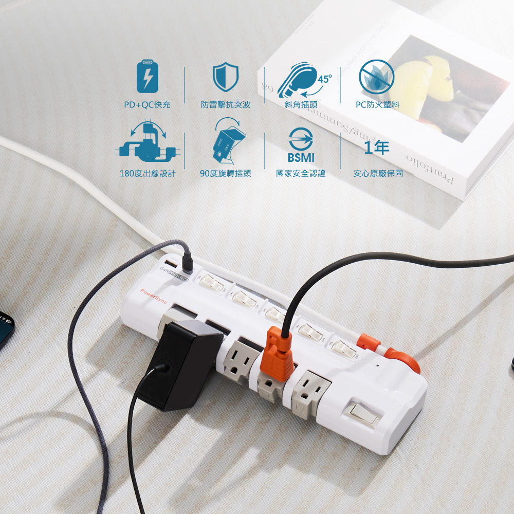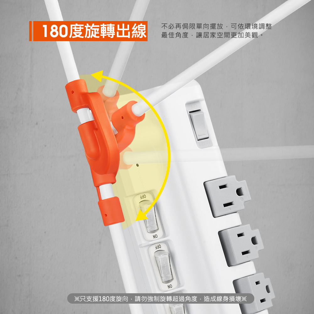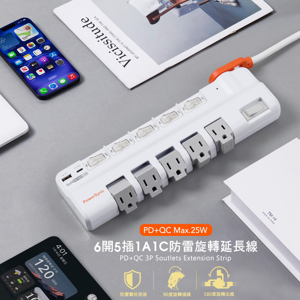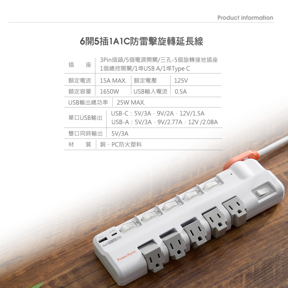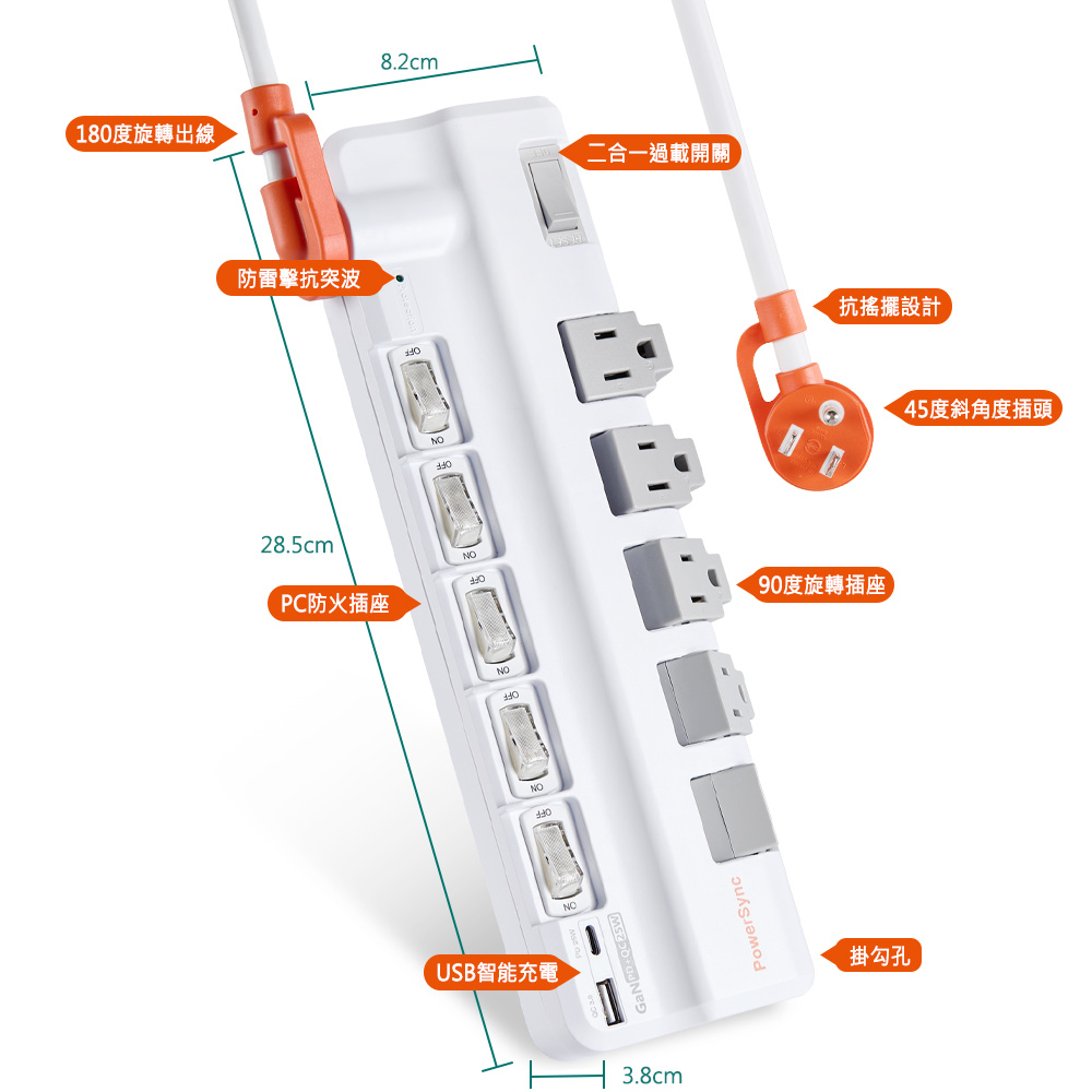 ● 品名:6開5插2埠1A1C防雷抗搖擺旋轉延長線