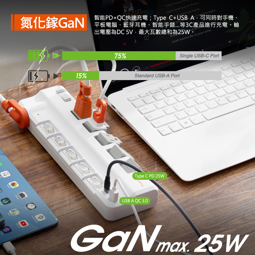 ●雙口USB輸出:Type A+Type C:5V/3A ※ Type C不支援無快充協議充電 ※ 突波吸收能量:100焦耳 瞬間最高可承受電流值:4500安培 瞬間最高可抑制電壓值:650伏特