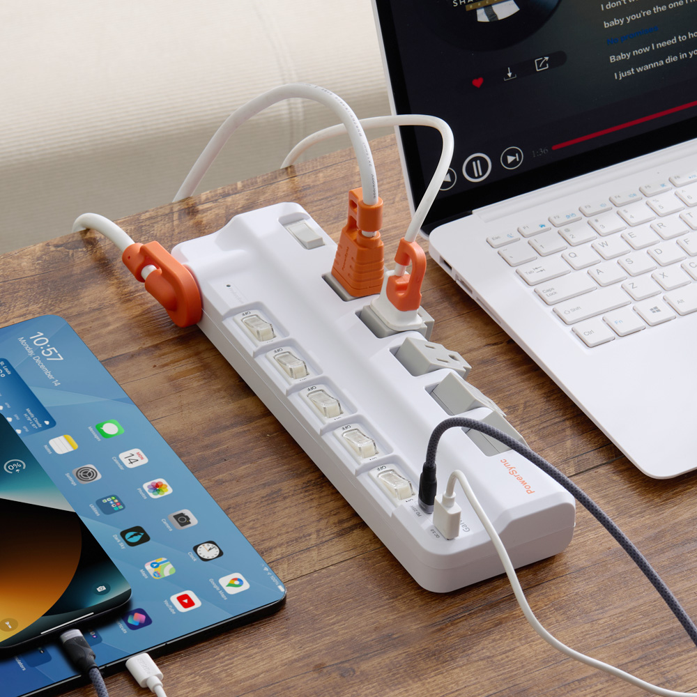 ● 插座:3Pin插頭/3孔-5個旋轉接地插座/5個電源開關 1個總開關/1埠USB-A/1埠USB-C