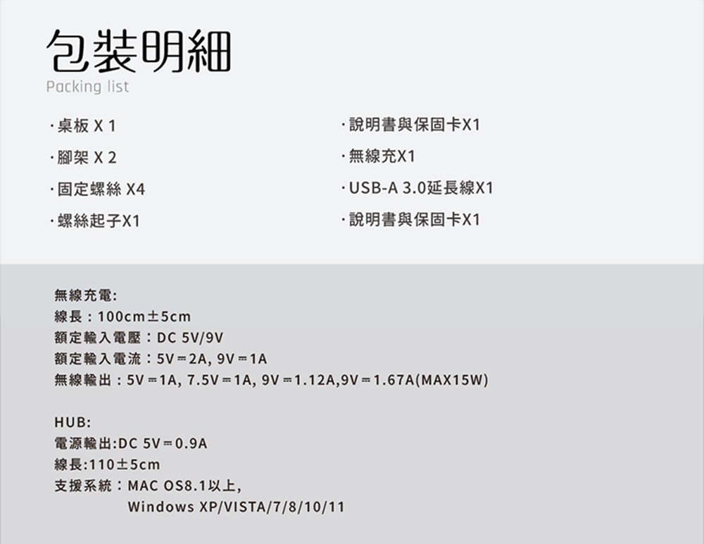 無線充X1、USB-A 3.0延長線X1、說明書與保固卡X1
