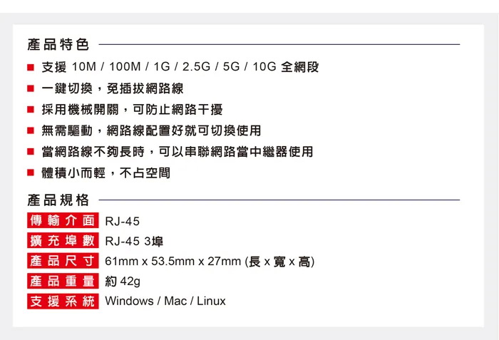 支援10M/100M/1G/2.5G/5G/10G全網段