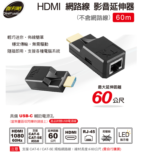 支援網路線材: 支援 CAT-6/5E 規格網路線:線材長度≦60公尺 (視輸出訊號決定)