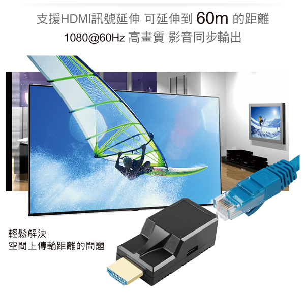 支援IEEE-568B標準,利用網路線,可將訊號延長:1080p最大可支援60公尺
