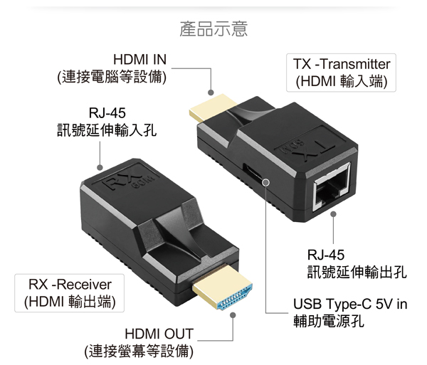 發送端(TX)具備USB-C輔助電源孔,附贈USB電源線