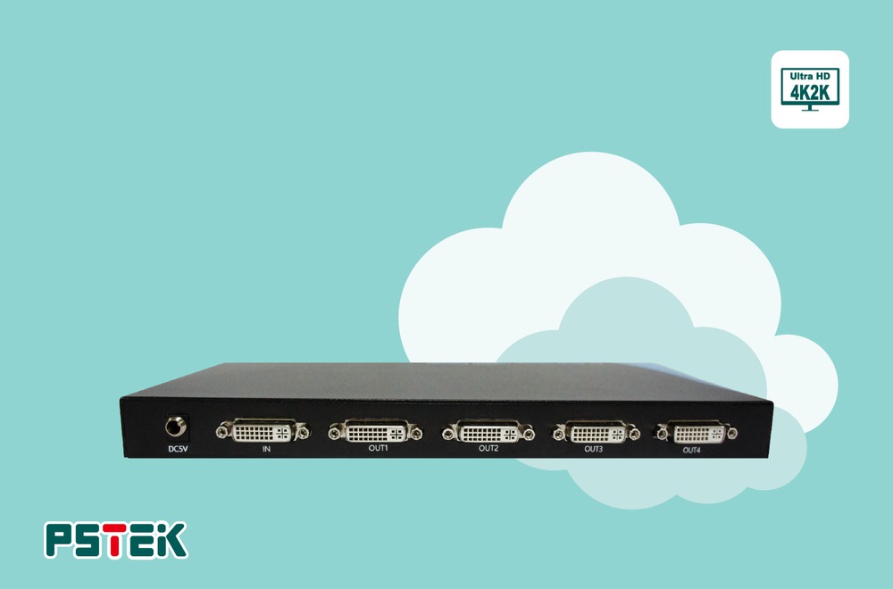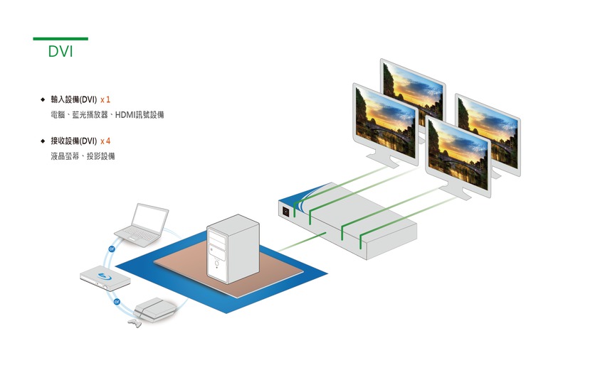 ‧將一組DVI數位高畫質顯示訊號同步輸出到四台DVI高畫質顯示器裝置上