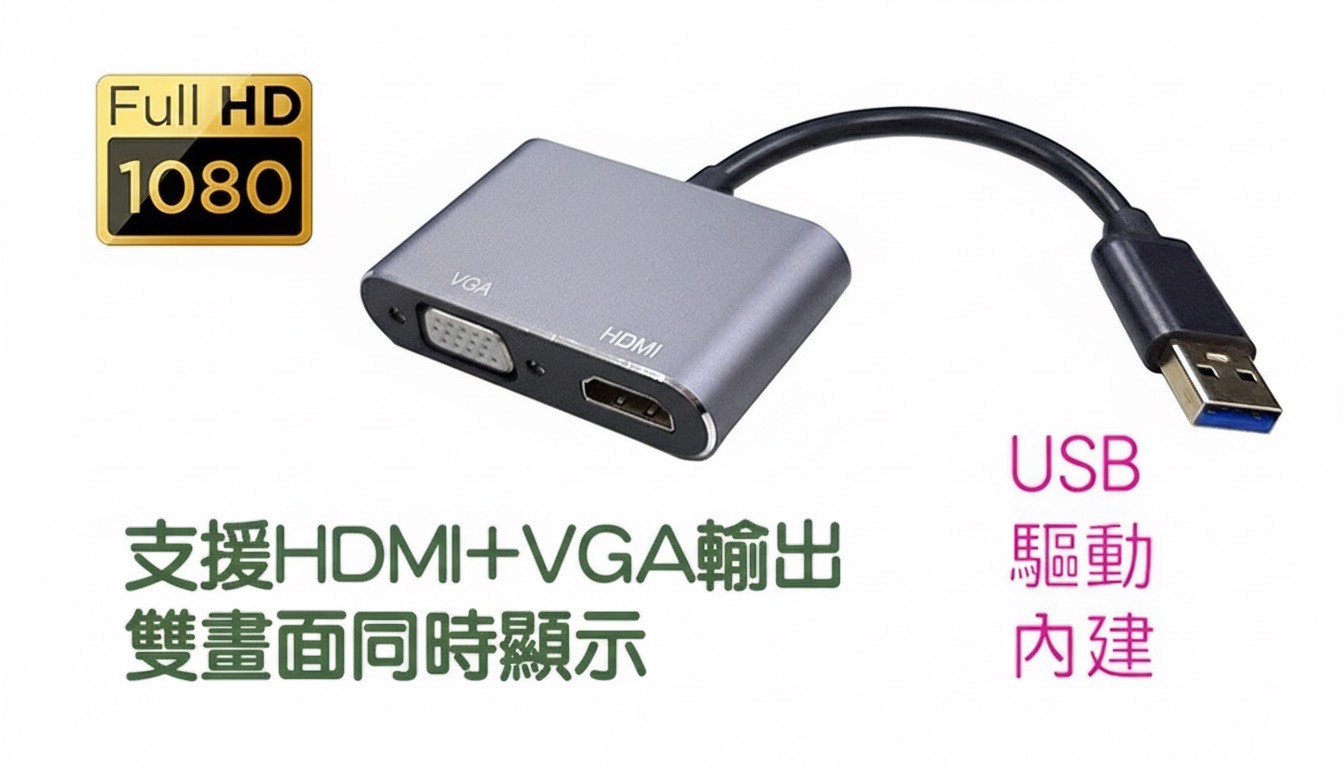 單向訊號轉換,可將主機端USB3.0影像訊號轉接輸出至VGA+HDMI介面之雙螢幕,最高可支援1080P,驅動內建,可支援外接螢幕的延伸、同步、主副螢幕切換、旋轉等四種顯示模式。