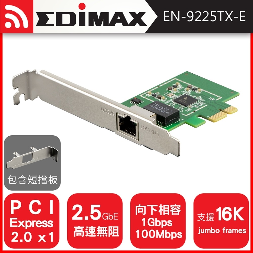 EN-9225TX-E是專為 PCI Express 介面所設計的2.5 GbE以太網路卡。它具備3速 2.5G,1G和100Mbps網路連接以及自動協商功能。 它可以簡單方便地增加或升級或替換您的伺服器,工作站或桌上型電腦的網路卡,以實現高性能,低功耗和更高的穩定度。