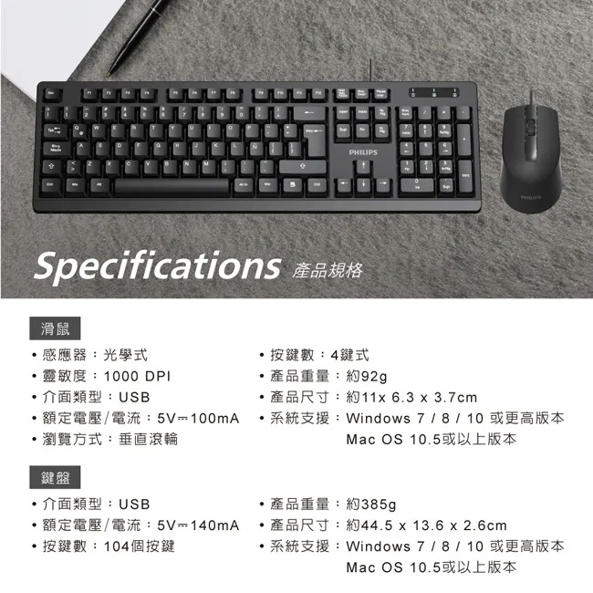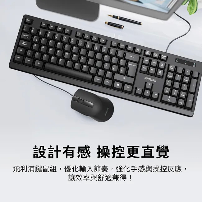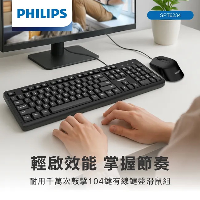 PHILIPS 耐用千萬次敲擊104鍵有線鍵盤滑鼠組 -SPT6234 |