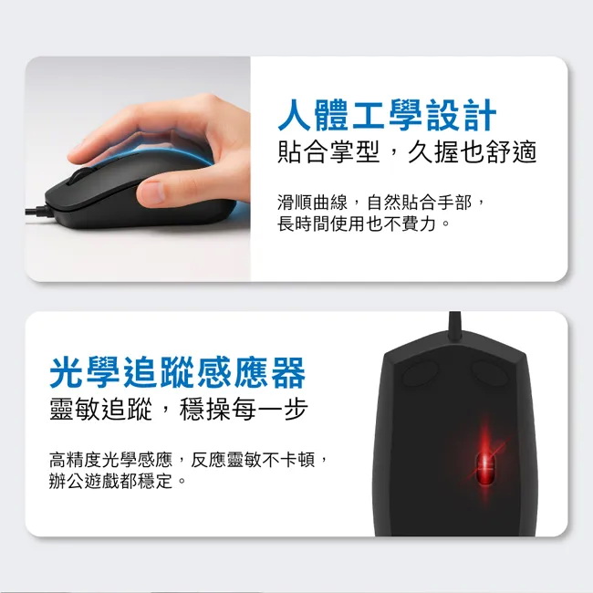 人體工學滑鼠,左右手皆宜,光學追蹤穩定流暢。